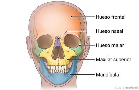 Los huesos faciales, desde la parte superior de la cabeza hasta la inferior, son el hueso frontal (bóveda craneal), el hueso de la nariz (nasal), el pómulo (hueso malar), el maxilar superior (maxilar) y el maxilar inferior (mandíbula).