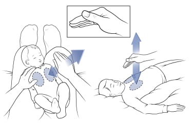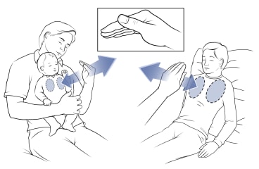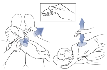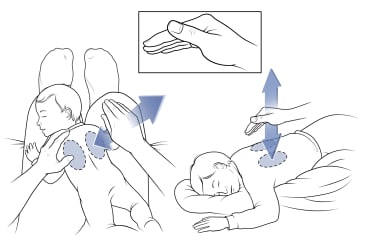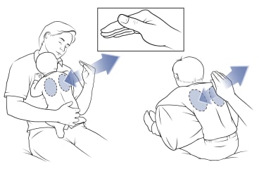 Para bebés: Acueste a su hijo de espaldas, en su regazo. Mantenga la cabeza y la parte superior del cuerpo de su hijo nivelados. Sostenga a su hijo con una mano. Con la otra mano, dé palmadas suavemente en la parte delantera del pecho y justo debajo del pezón. Dé palmadas durante 1 a 3 minutos. Repítalo en el otro lado del pecho.