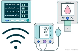 Es posible que pueda usar dispositivos para enviar información al proveedor de atención médica a través de Internet. Estos incluyen dispositivos para controlar el nivel de oxígeno, la frecuencia cardíaca, la presión arterial o el azúcar en la sangre.