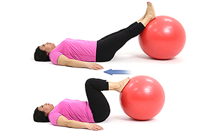 - Use las piernas para hacer rodar el balón de ejercicio hacia sí. Deje que las rodillas se flexionen y se acerquen a su pecho.