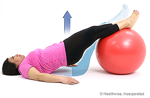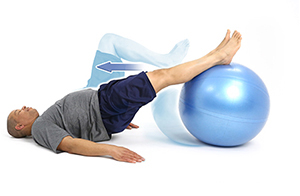 - Acuéstese de espaldas con las piernas elevadas y las pantorrillas apoyadas en el balón. Para aumentar la dificultad del ejercicio, apoye los talones sobre el balón.