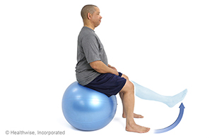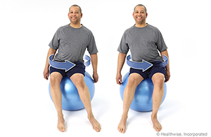 - Apoye las manos en el balón cerca de las caderas o un objeto firme cerca de usted. (Si se siente muy estable sobre el balón, apoye las manos sobre el regazo o a los costados).