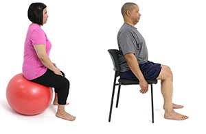 - Siéntese sobre un balón o una silla, con los pies bien apoyados en el piso directamente frente a usted.