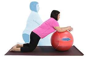 - Arrodíllese sobre el balón. Coloque las manos en el piso frente a usted.