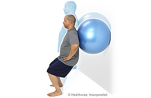 - Baje lentamente como si se fuera a sentar en una silla, haciendo rodar el balón con la espalda a medida que baja. El balón debe desplazarse con usted pero debe permanecer presionado contra la pared.