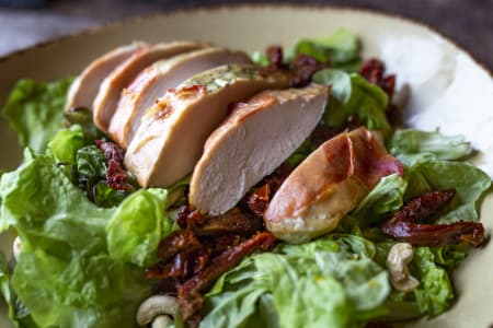 - Ensalada de pollo asiática. Combine rodajas de pechugas de pollo asadas con una bolsa de lechuga prelavada, gajos de mandarina enlatados y almendras fileteadas para preparar fácilmente una ensalada de pollo asiática. Para completar la ensalada, se puede agregar vinagreta de jengibre y soya comprada en la tienda.