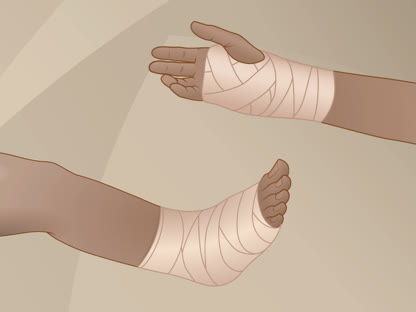 La compresión, o envolver la zona con una venda elástica (como una venda Ace), ayudará a reducir la hinchazón. No ajuste el vendaje demasiado, ya que eso puede provocar más hinchazón debajo de la zona afectada. Afloje el vendaje si le aprieta demasiado. Las señales de que el vendaje está demasiado apretado incluyen entumecimiento, hormigueo, aumento del dolor, frialdad e hinchazón en la zona debajo del vendaje.
