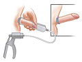 Un dispositivo de vacío, el cual a veces se usa para tratar los problemas de erección (disfunción eréctil), es un tubo de plástico que se coloca alrededor del pene. Usted se aplica un lubricante en la base del pene e introduce el pene en el tubo. Se extrae aire del tubo mediante un bombeo, lo que crea un vacío. El vacío ayuda a que la sangre fluya al pene, produciendo un estado similar al de la erección en aproximadamente 5 minutos. Se coloca un anillo de tensión alrededor de la base del pene para mantener la erección, y se saca el tubo.