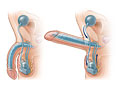 - Un implante inflable de dos piezas tiene el reservorio al comienzo de los cilindros (en la base del pene) y la bomba y la válvula de descarga en el escroto.