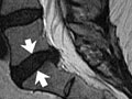 Una vista lateral de la columna lumbar muestra discos, conducto vertebral y raíces nerviosas normales (ver figura 1). Las raíces nerviosas normalmente flotan en el conducto lleno de líquido. La figura 2 muestra una pequeña hernia de disco que sobresale en el conducto en dirección a las raíces nerviosas.