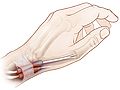 Su médico puede o no utilizar la prueba de Finkelstein para ayudar a diagnosticar la tenosinovitis de De Quervain. Para realizar esta prueba, cierre el puño con el pulgar adentro. Luego, flexione la muñeca hacia el dedo meñique. Si siente dolor en la zona del pulgar en la muñeca, entonces es muy probable que tenga la tenosinovitis de De Quervain.